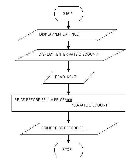 เขียน Flow Chart สำหรับคำนวณราคาสินค้าก่อนลดราคาหากทราบราคาหลังลดราคาเป็นเท่าไหร่